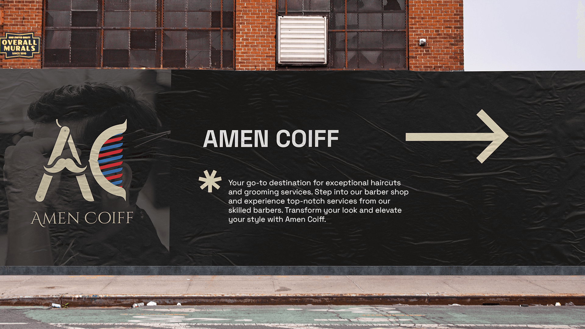Amen Coiff is a contemporary barbershop in Tunisia where the entire brand revolves around the owner himself. The goal is to craft a bold visual identity that turns his name into a timeless icon—one symbol that fuses his initials with classic barber elements, creating a mark that is instantly recognizable in the street and online. From the logo to the colors, typography, and signage, every detail is designed to reflect his personal style, Tunisian character, and the refined experience clients feel the moment they step into the shop.