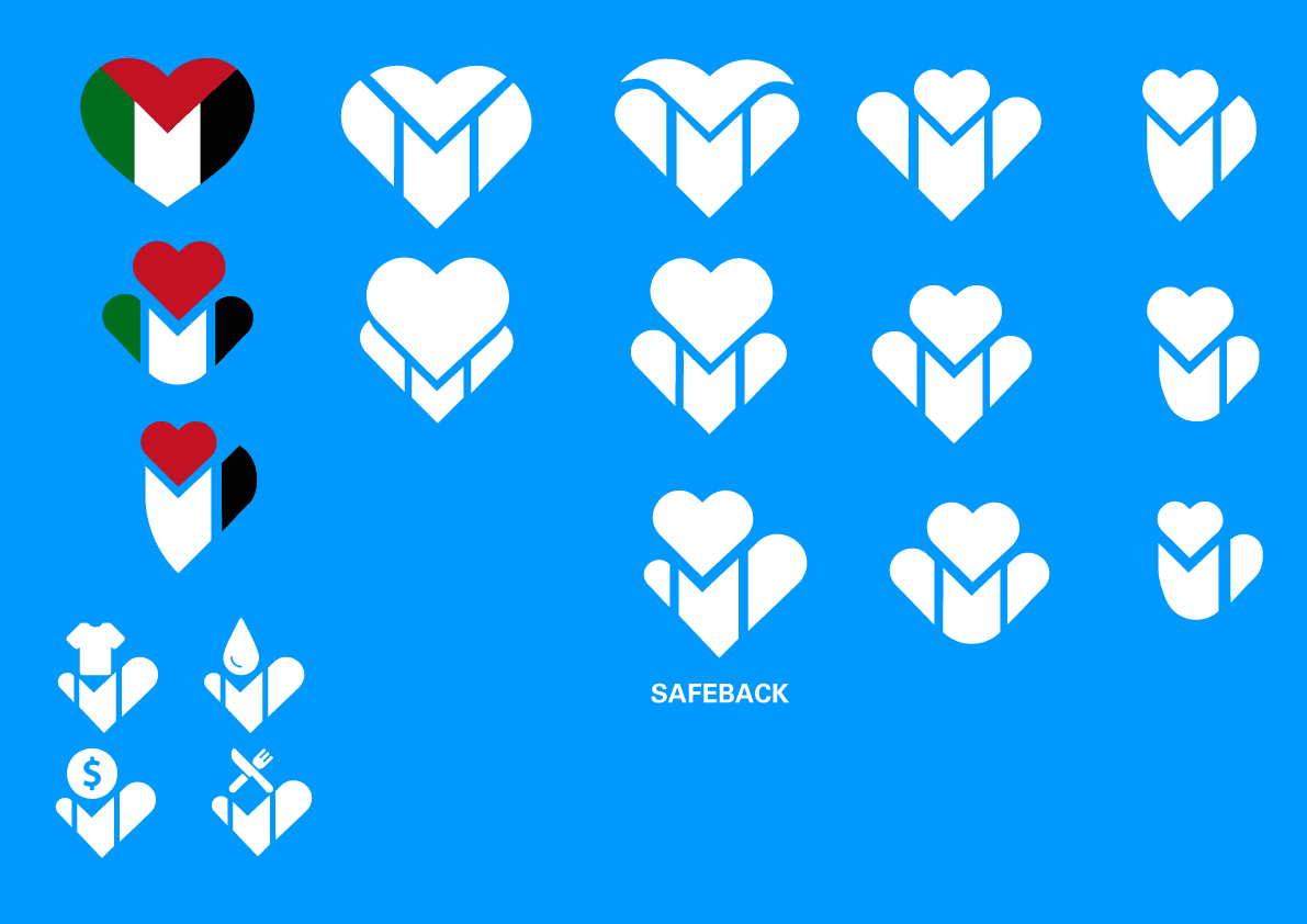 After exploring multiple iterations, the final mark evolves into a dual meaning: it depicts hands offering care that simultaneously form a heart shape. This core geometry was then expanded into a functional iconography system (Clothes, Blood, Money, Food) to ensure a cohesive visual language throughout the app.